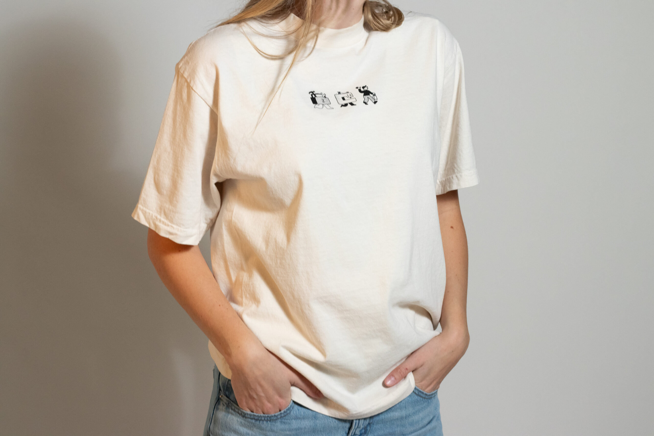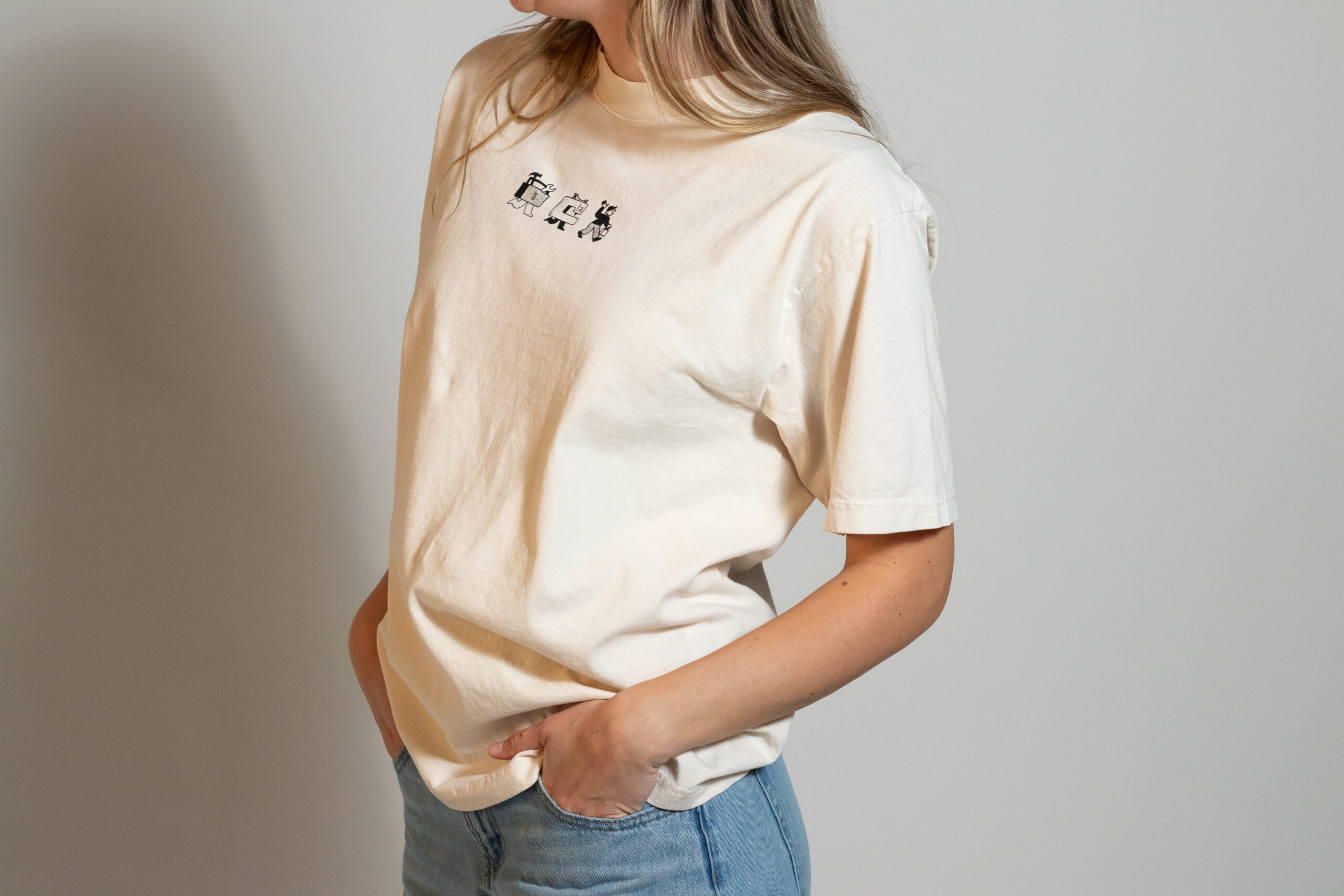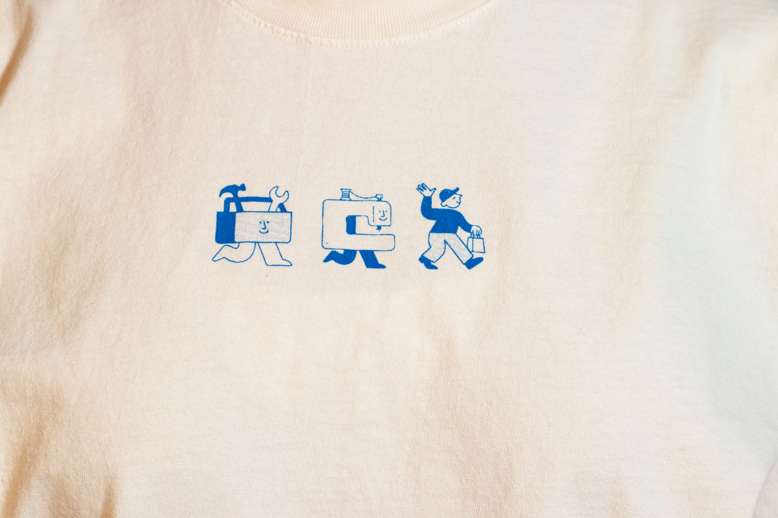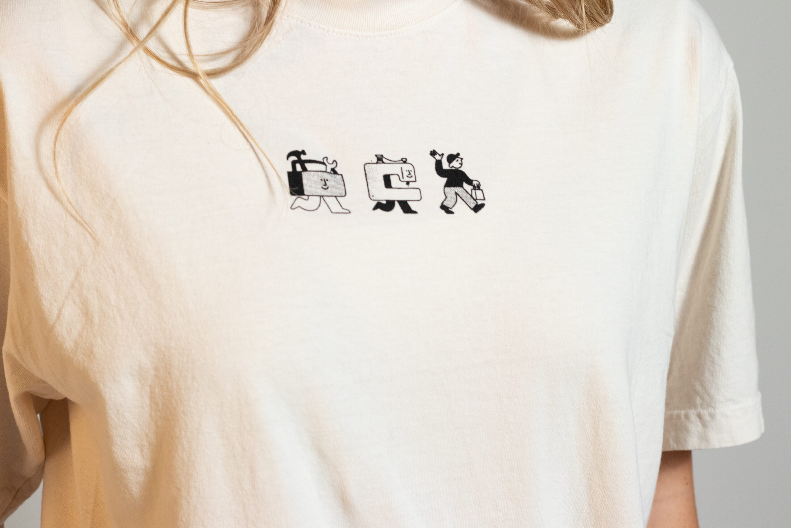 A tiny parade of makers marches across this T-shirt. It’s a soft reminder that creativity is messy, mobile, and always on the move.