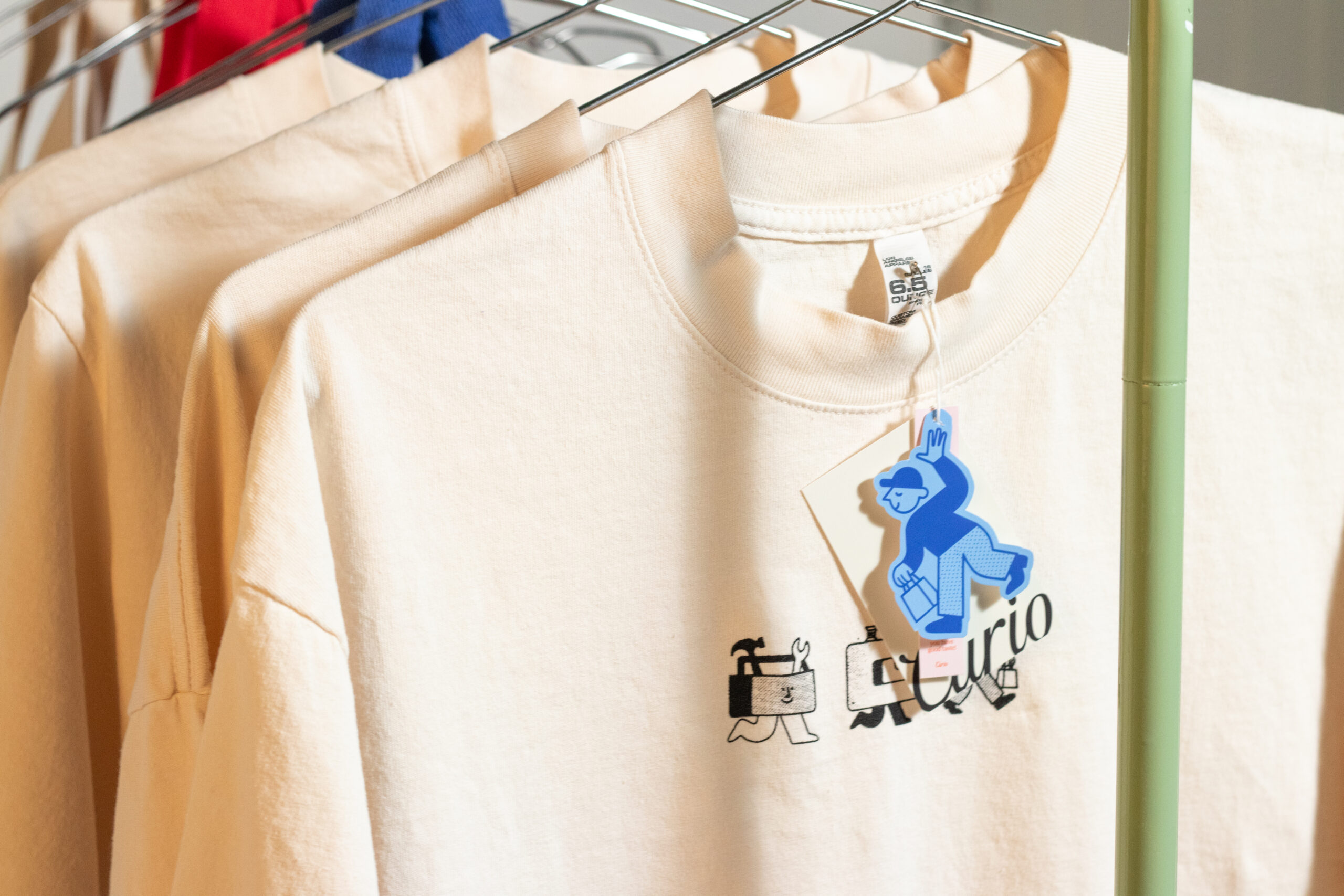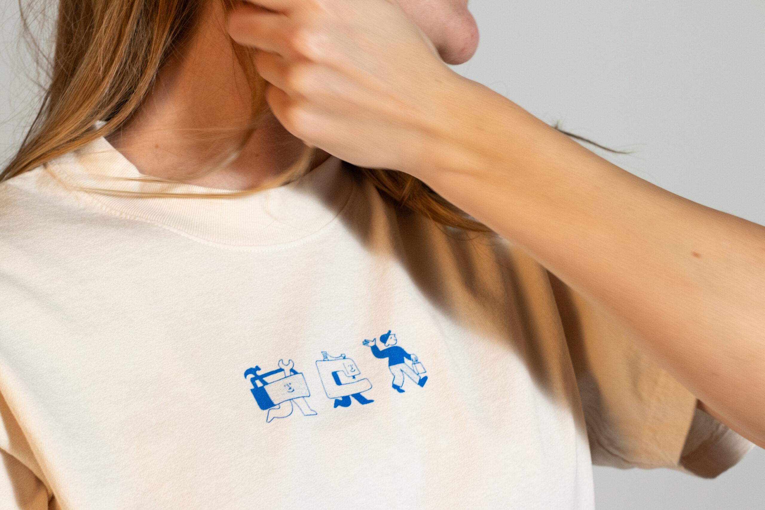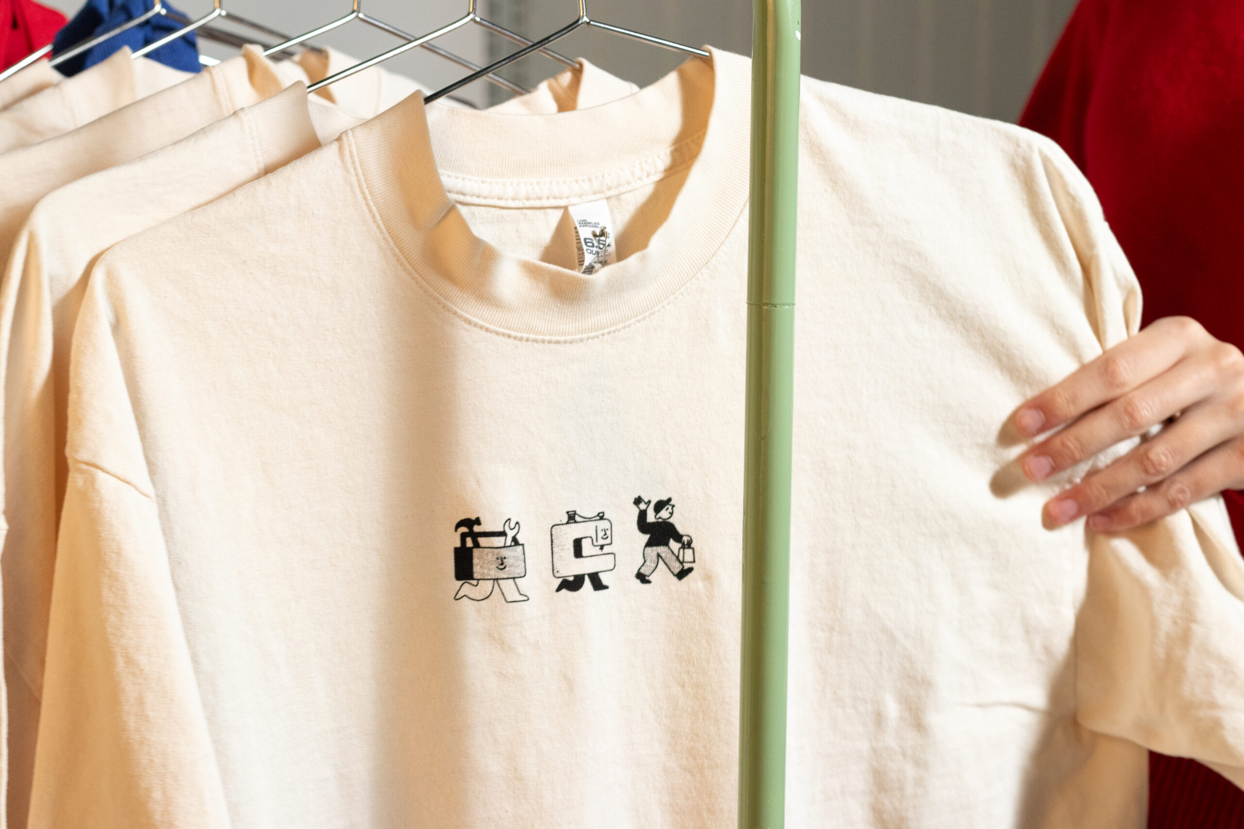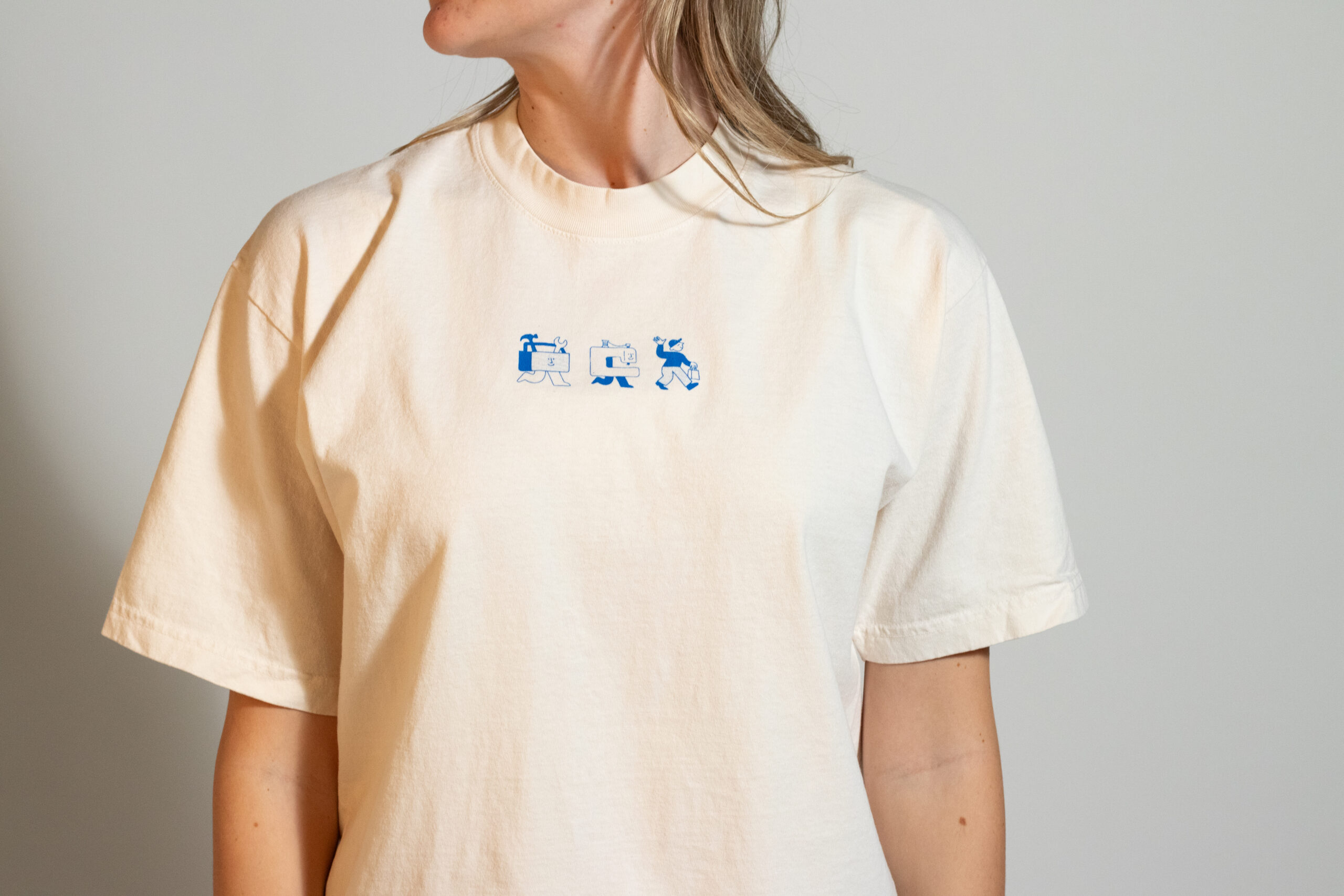 A tiny parade of makers marches across this T-shirt. It’s a soft reminder that creativity is messy, mobile, and always on the move.