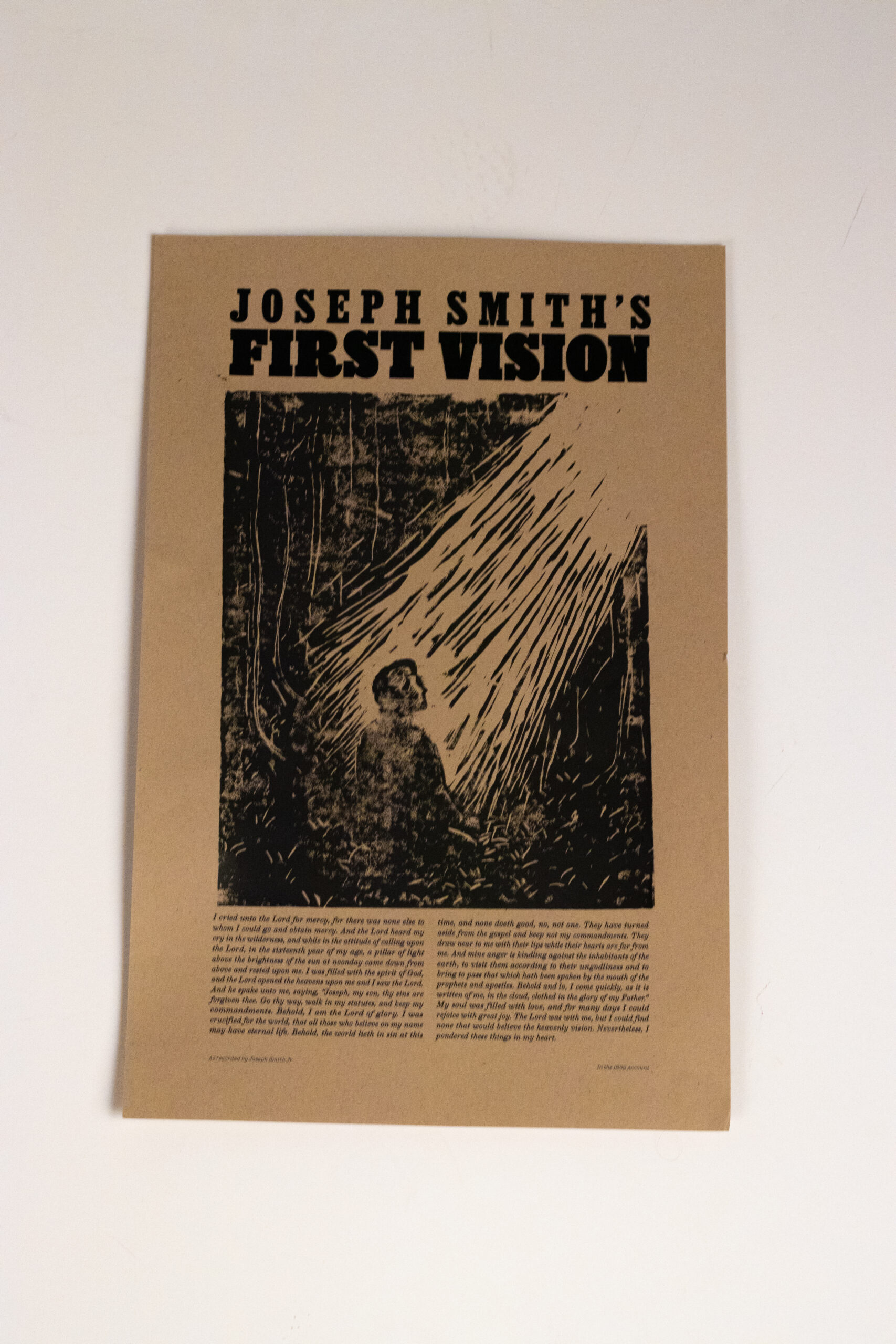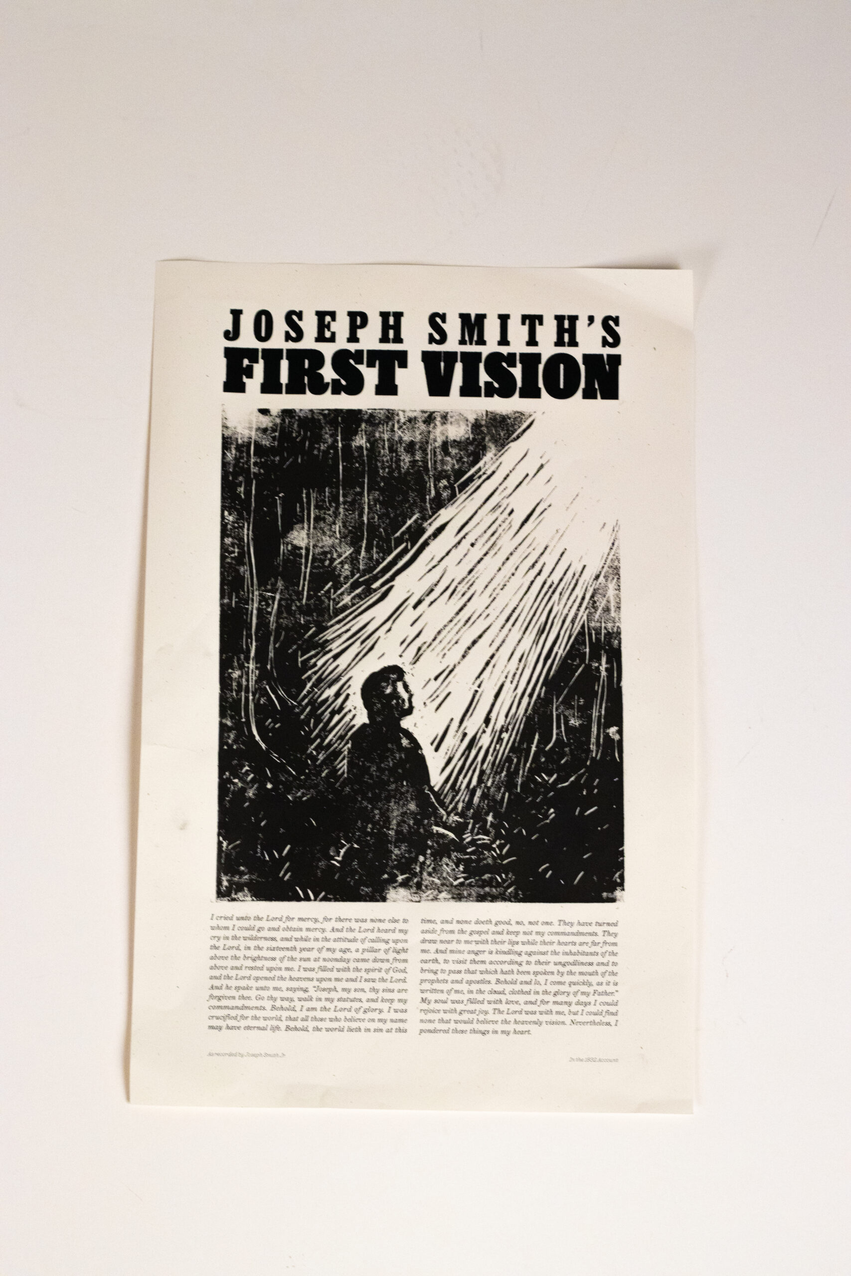 While studying the different accounts of the First Vision, Landon was struck by the personal nature and description of light and darkness in the 1832 account. In this, Josephs first account, he focuses less on the implications for the restoration and more on the glory and love of God, which affected him personally. This poster visually demonstrates the light and glory that we can feel in the presence of The Lord, as described in Joseph Smith’s 1833 first vision account.