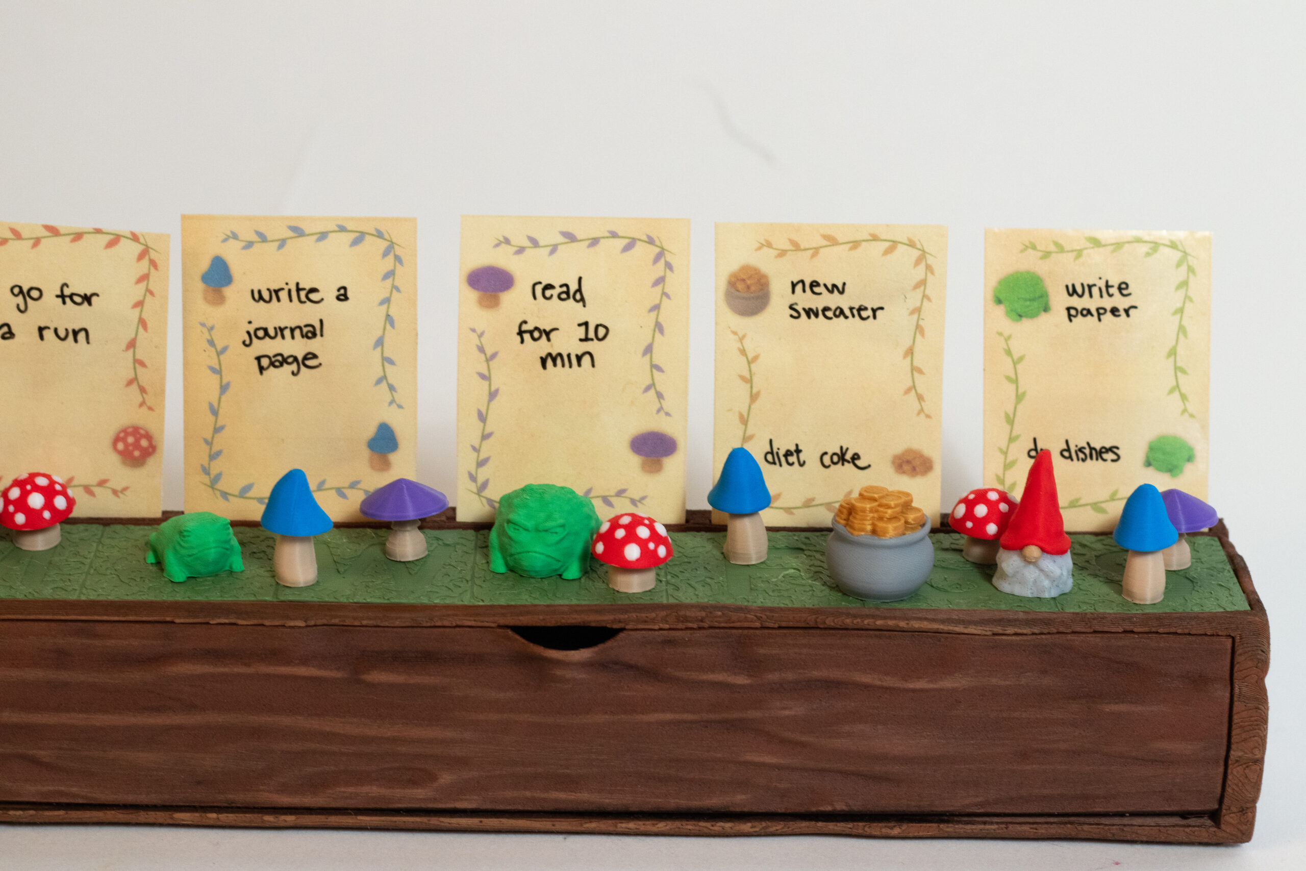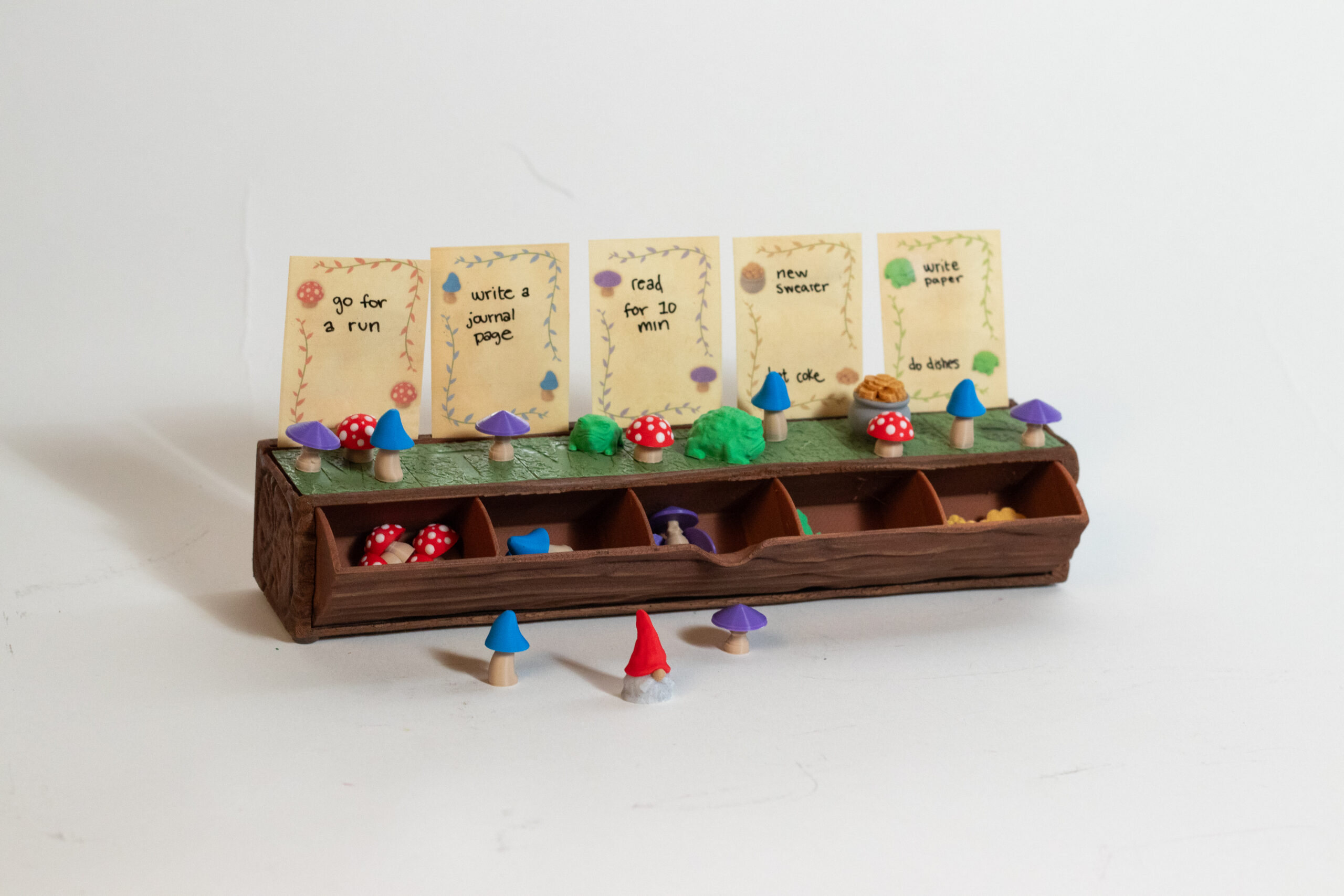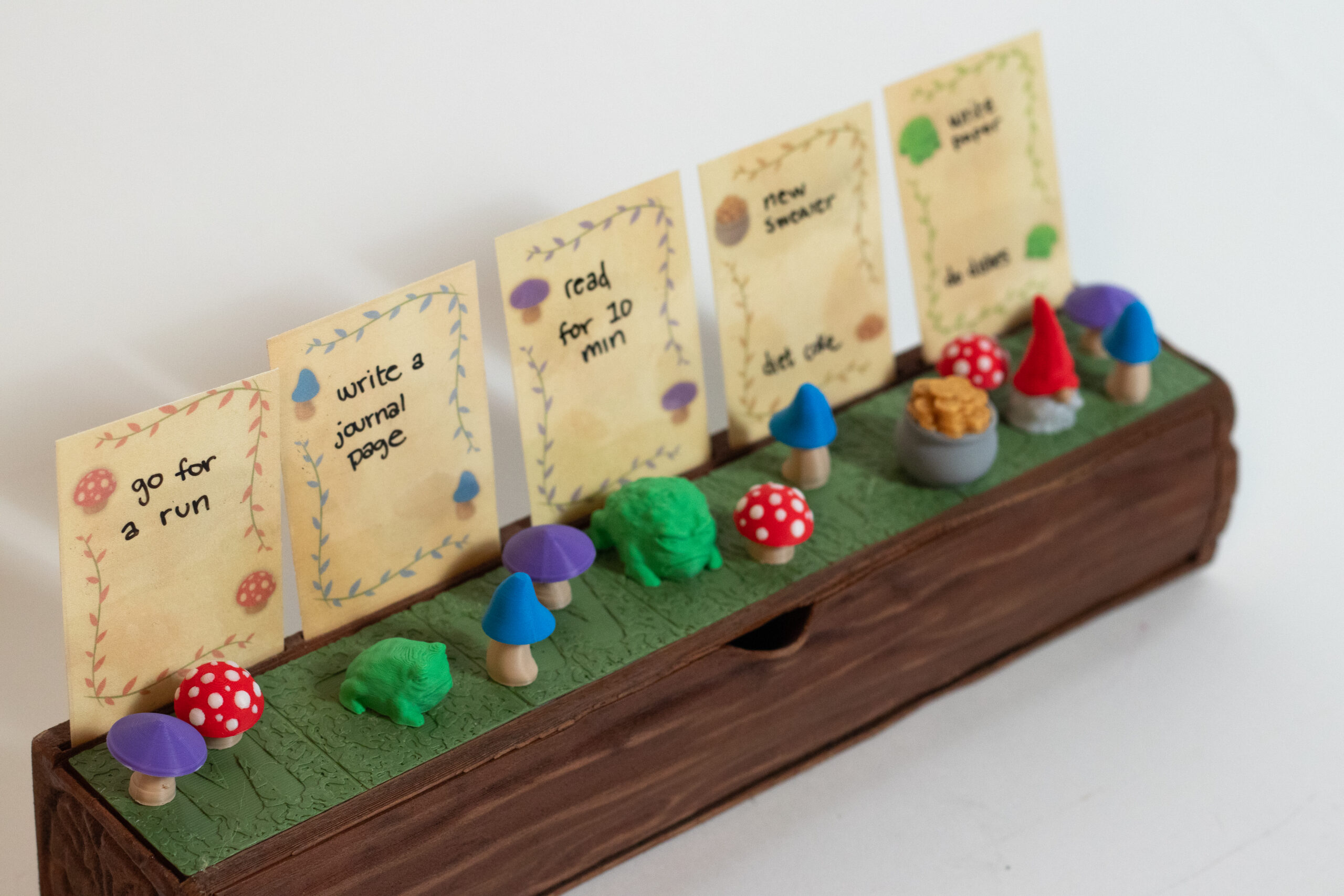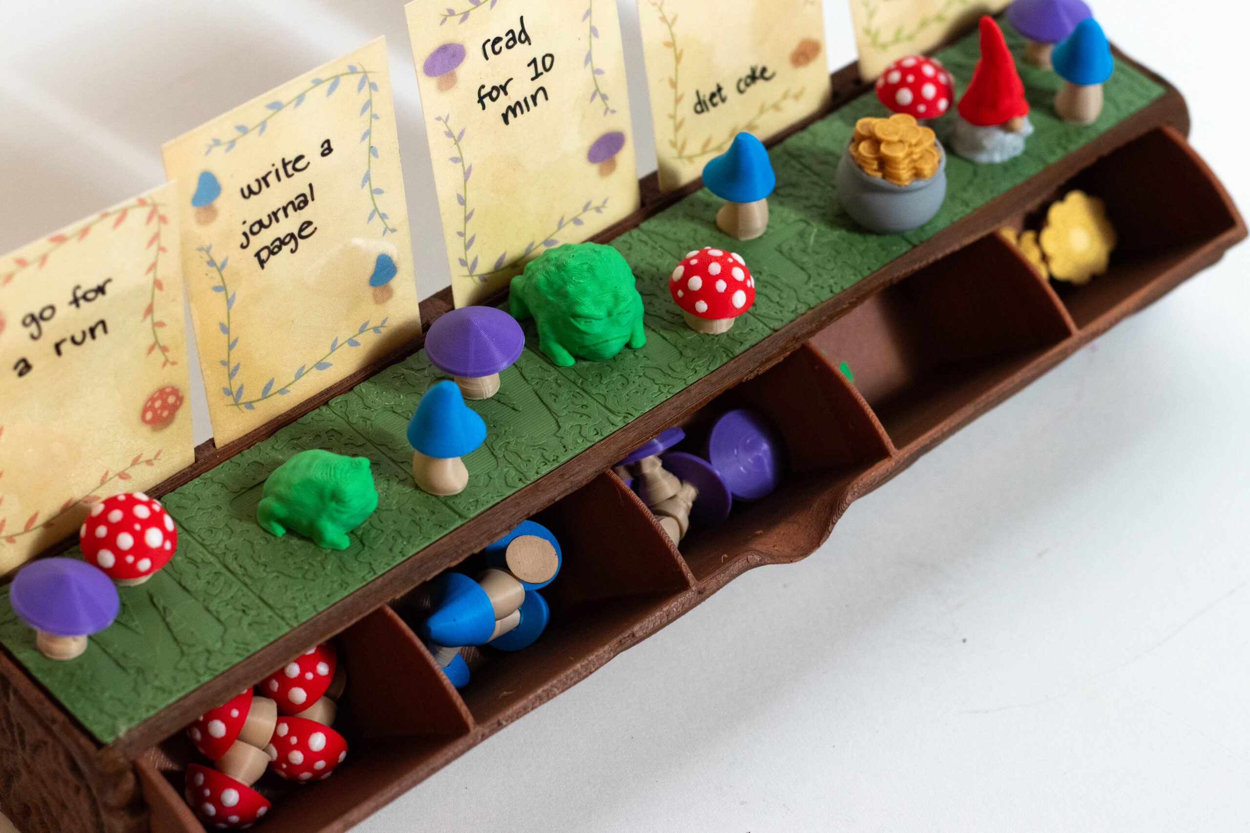Building good habits is hard… but not for a fearless gnome! The Habit Log makes it easy to set goals, build habits, and accomplish tasks with a charming, fully magnetic tactile system. You play the role of The Keeper of the Log, guiding a brave gnome through the week ahead. Each day you complete a habit, your gnome gets to plant a magnetic mushroom on the log behind them—creating a colorful trail that lets you see your progress grow. When bigger tasks appear, they take the form of stubborn toads and frogs blocking the path. Overcome them, and your gnome earns pots and piles of gold—the rewards you set for yourself.