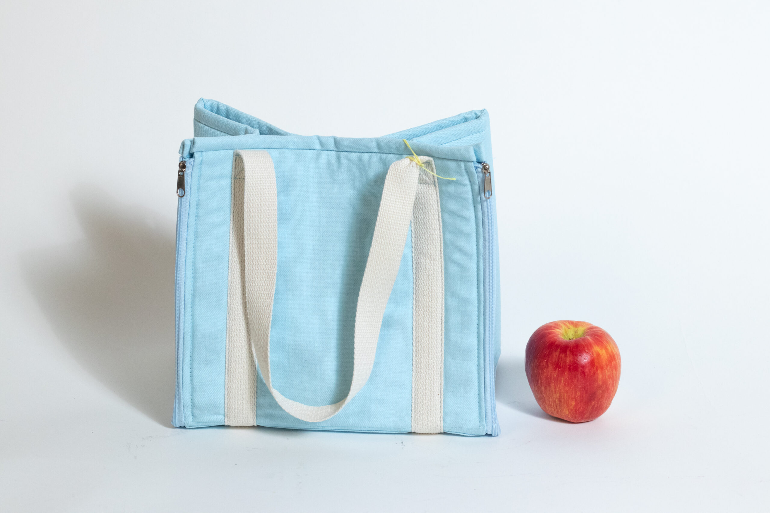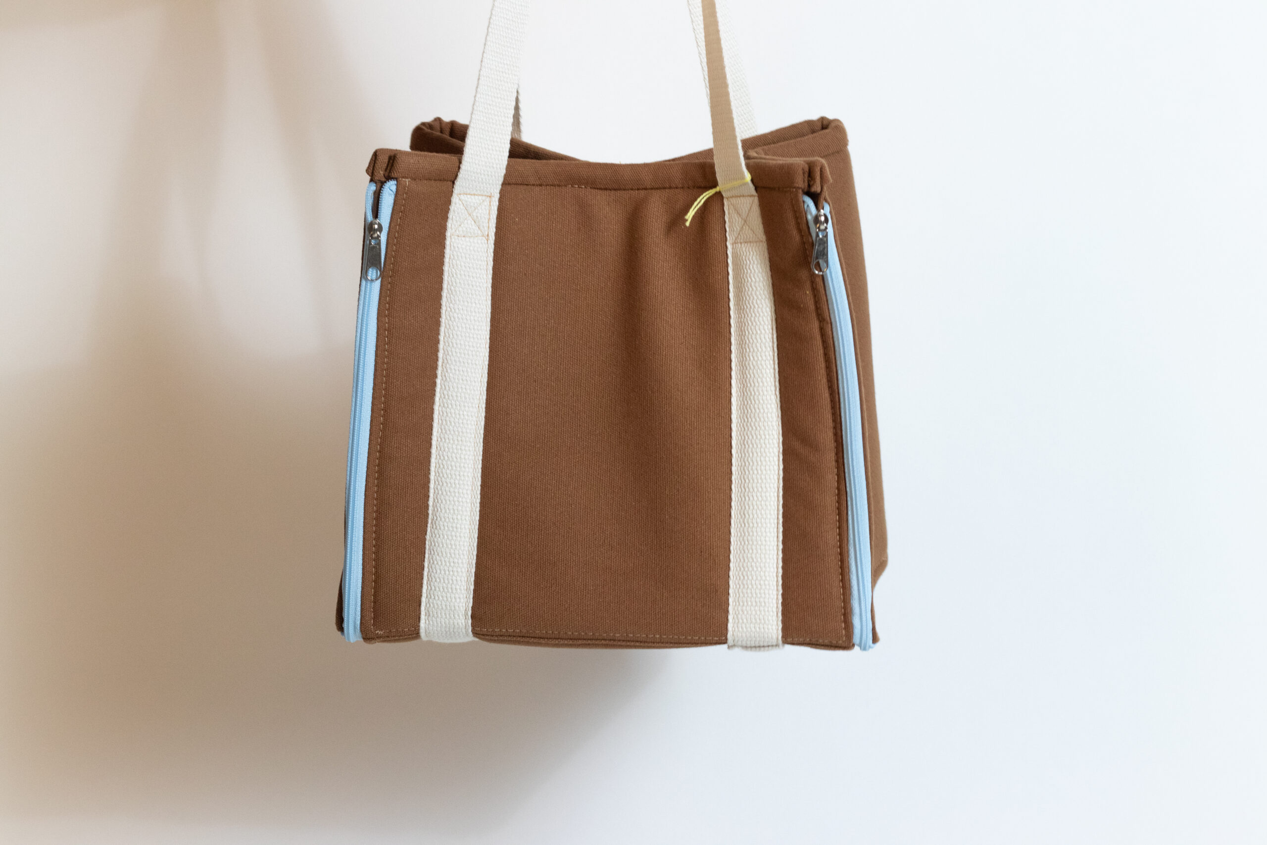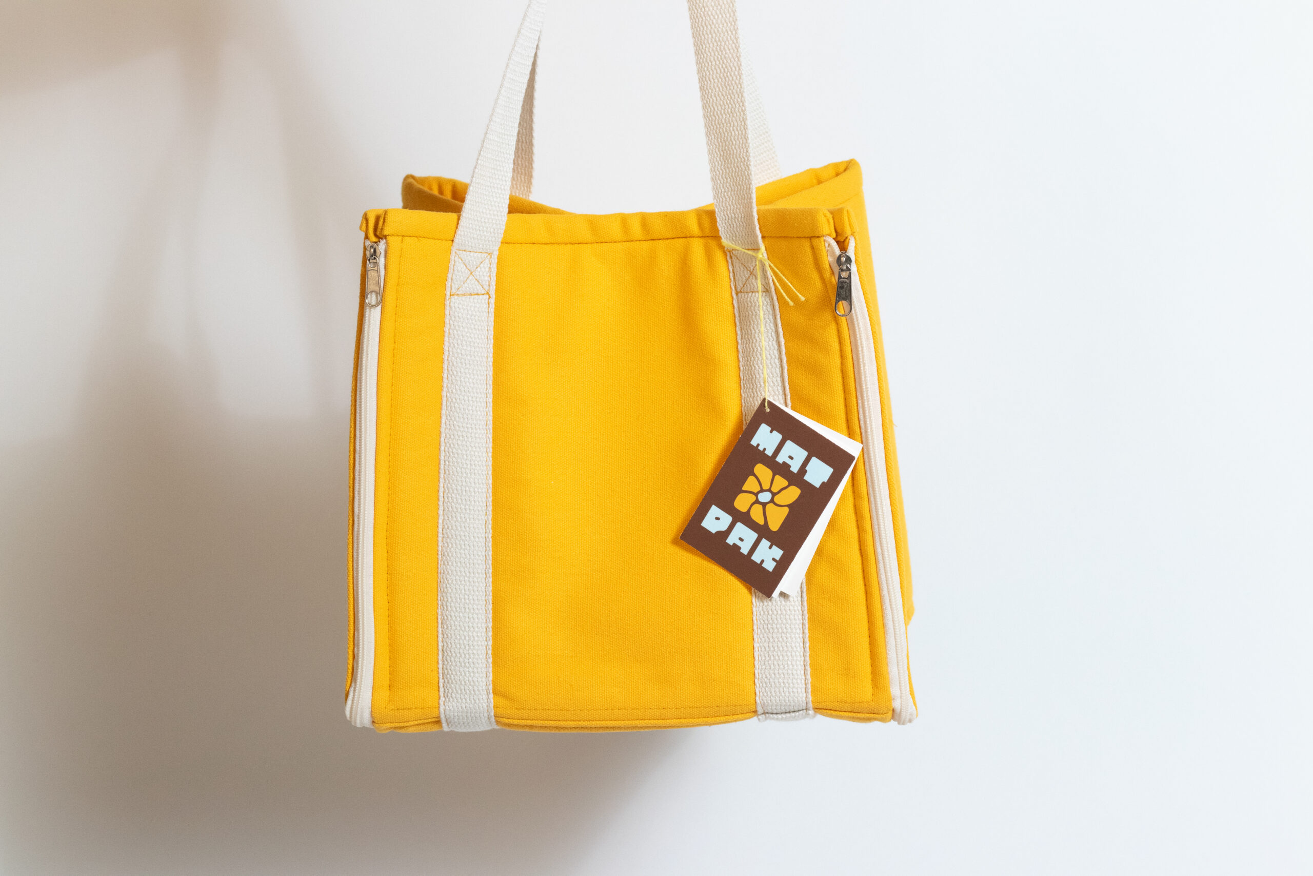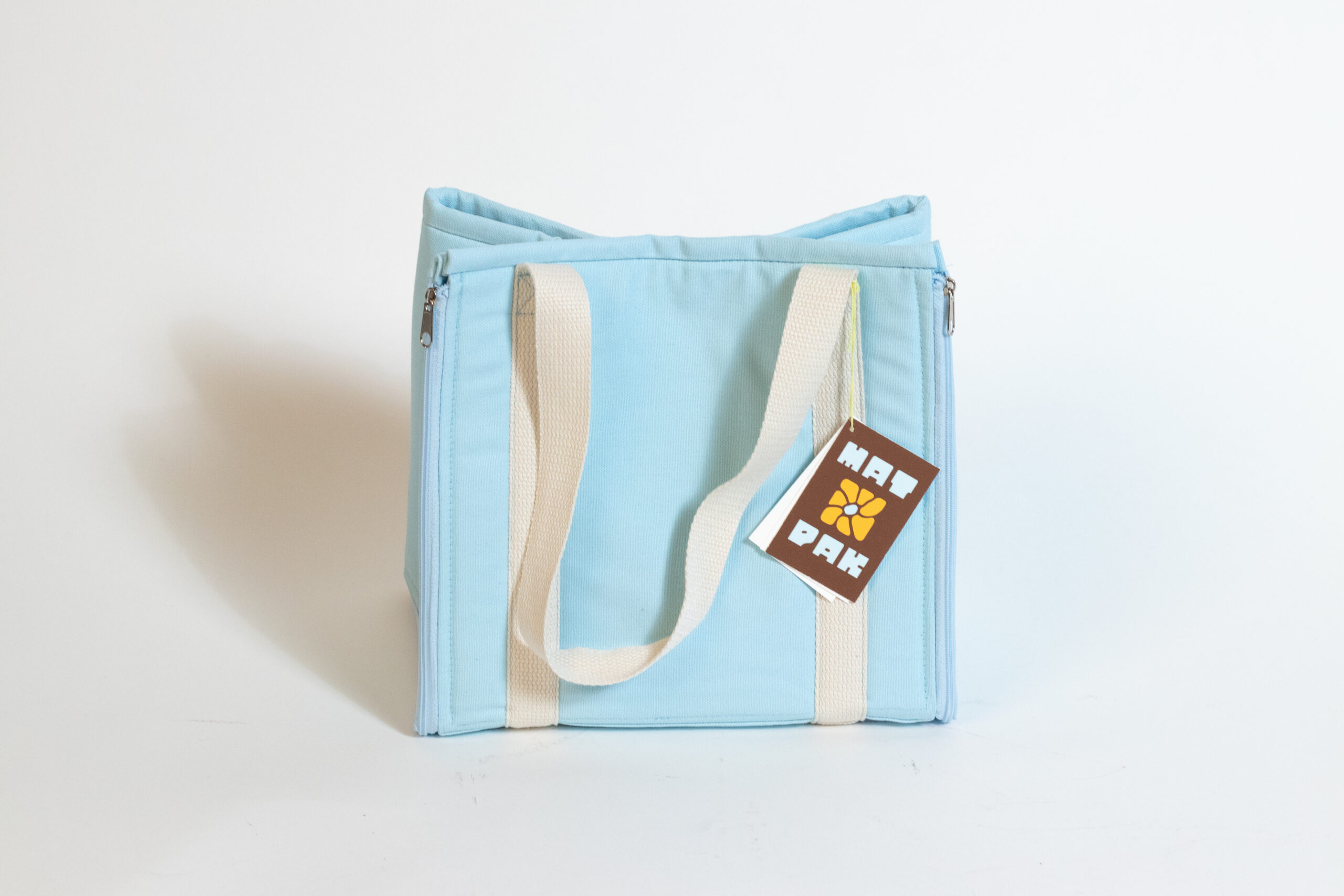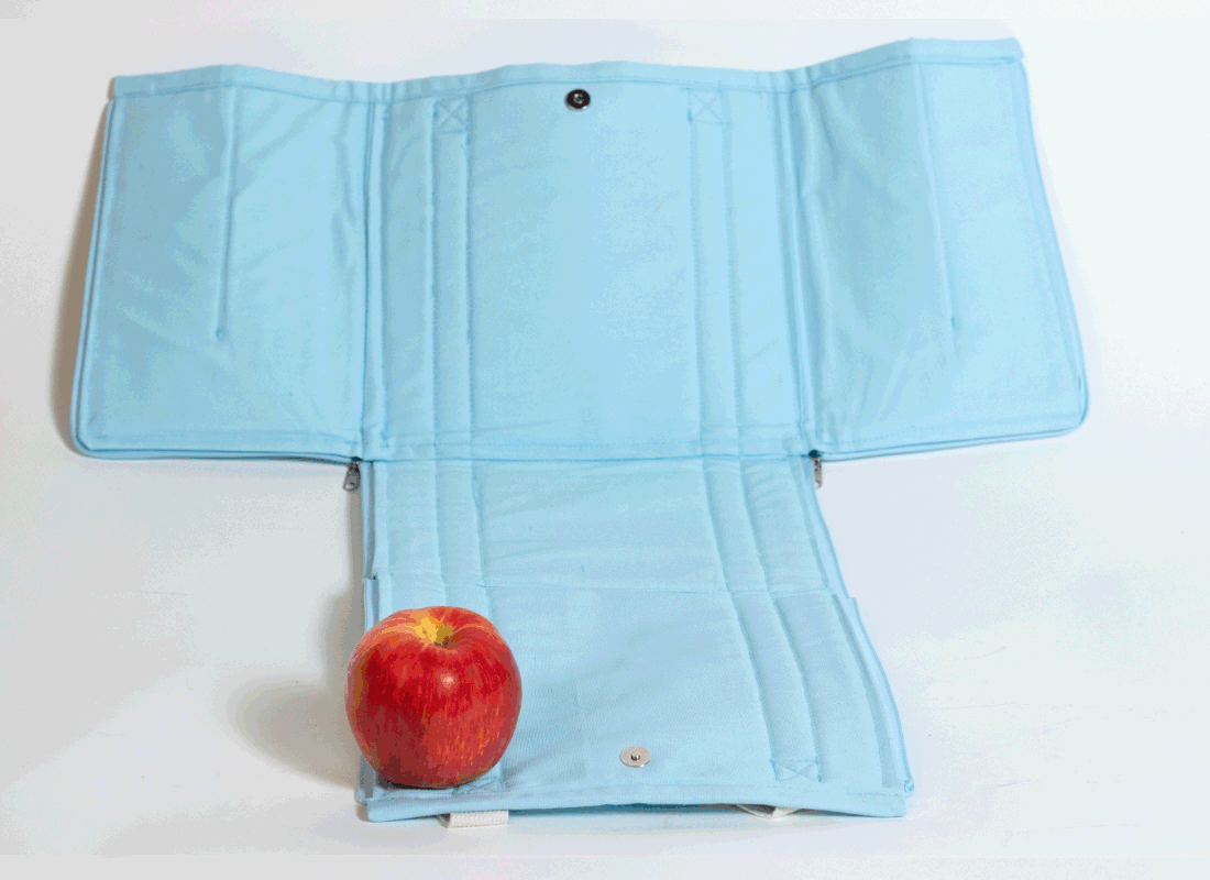 A handmade lunch bag featuring a built-in mat that unzips for use and expands fully flat when you need quick, easy storage.