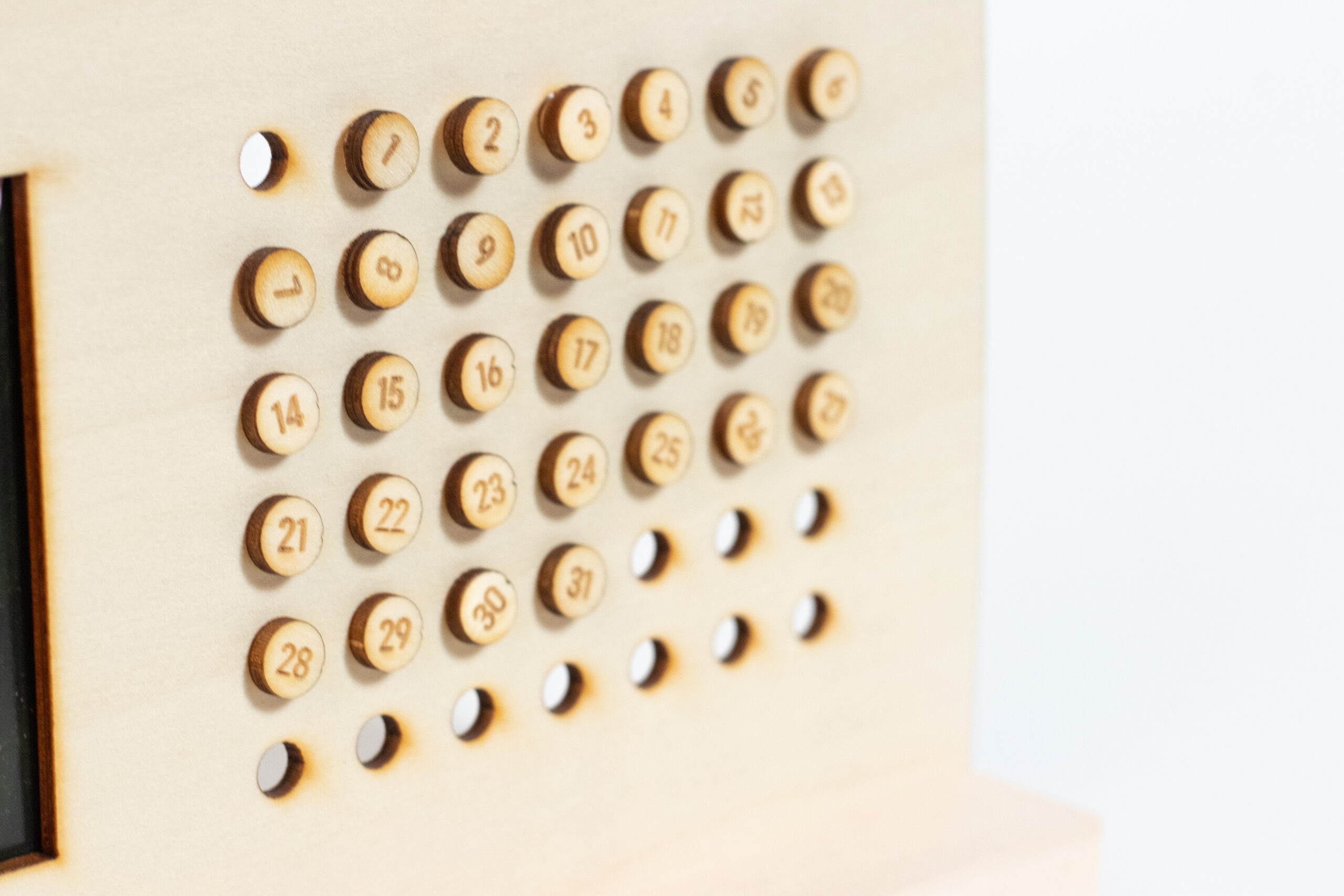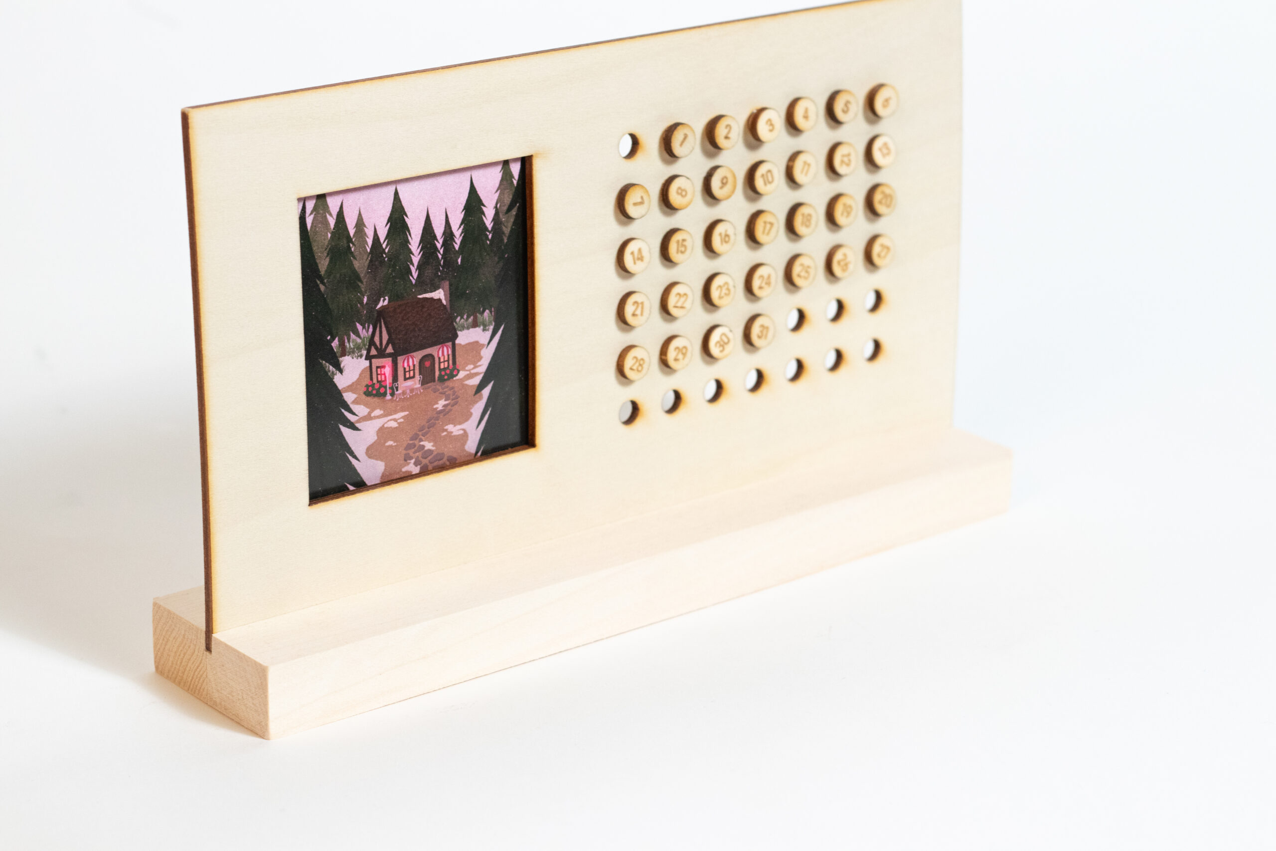 Reusable peg board calendar with twelve monthly illustrations included.