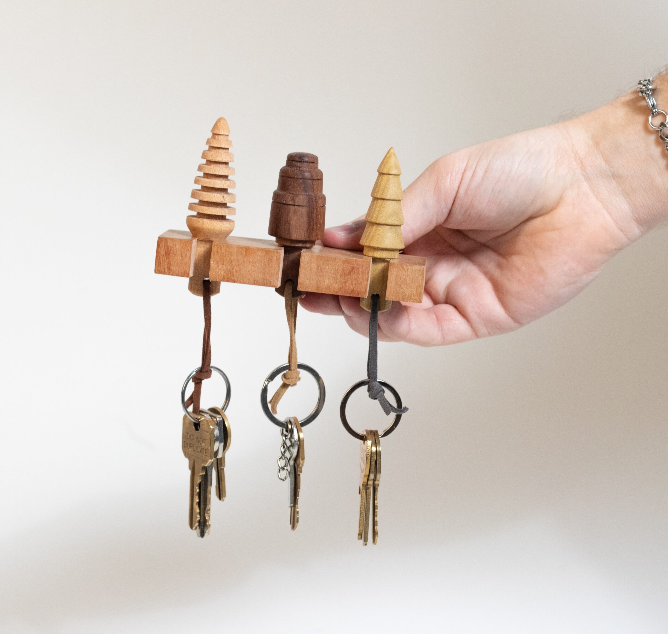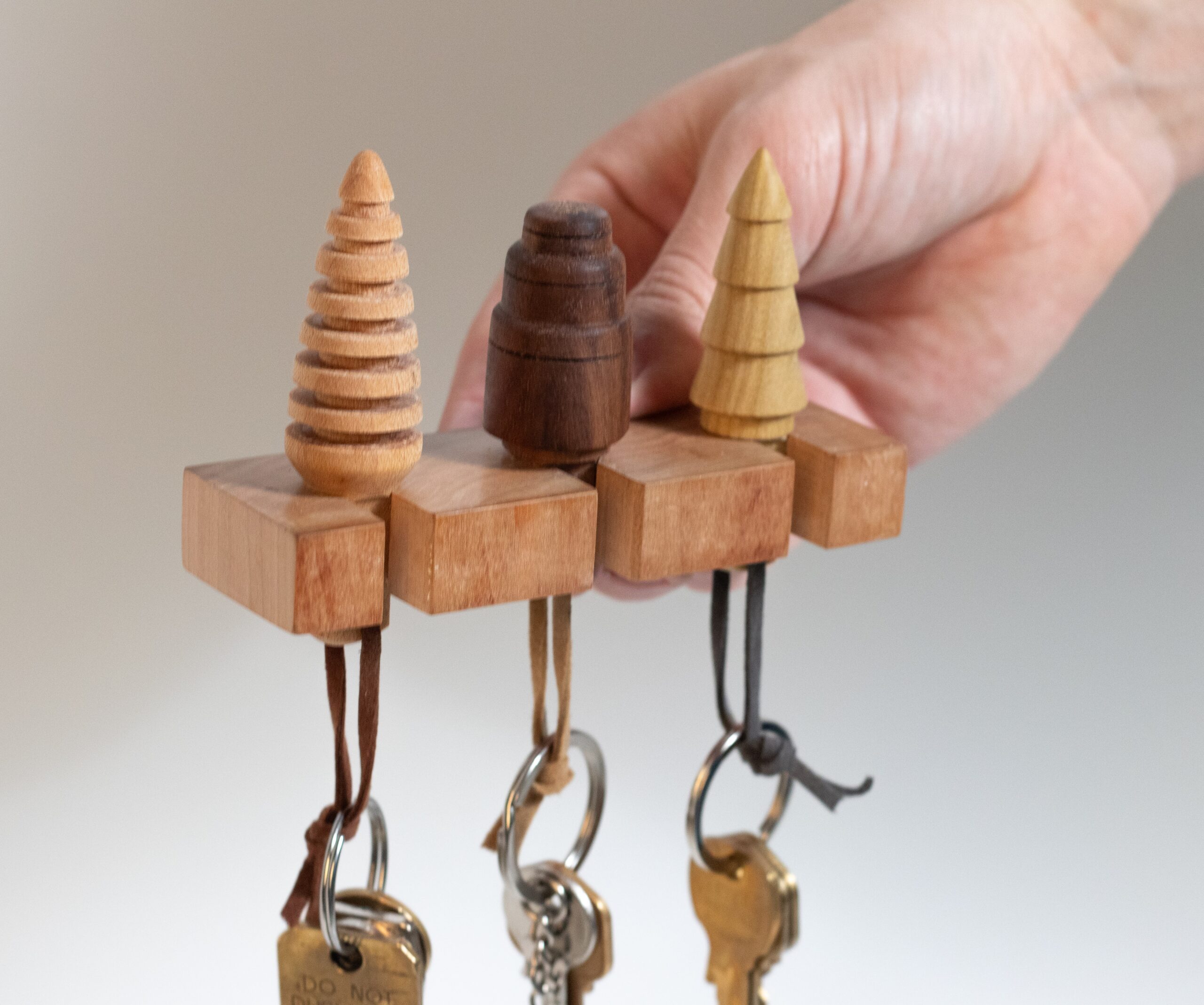 Natural materials meet everyday life in a hand made key holding system carved from cherry, maple, walnut, and poplar.