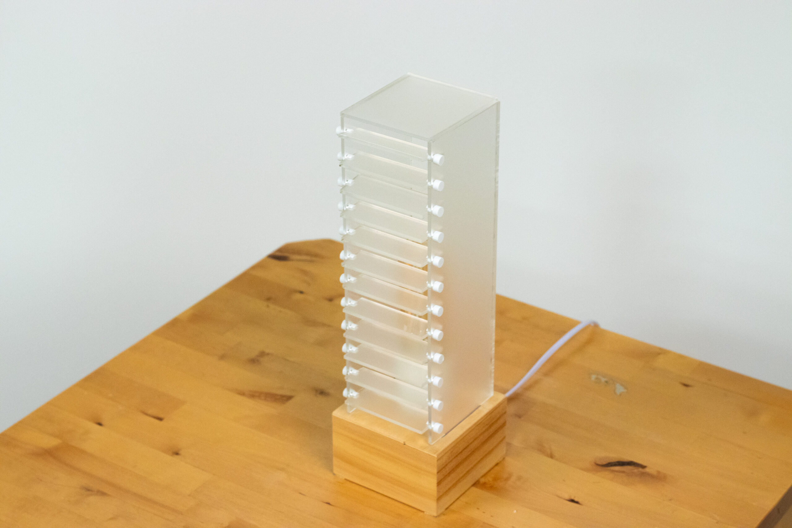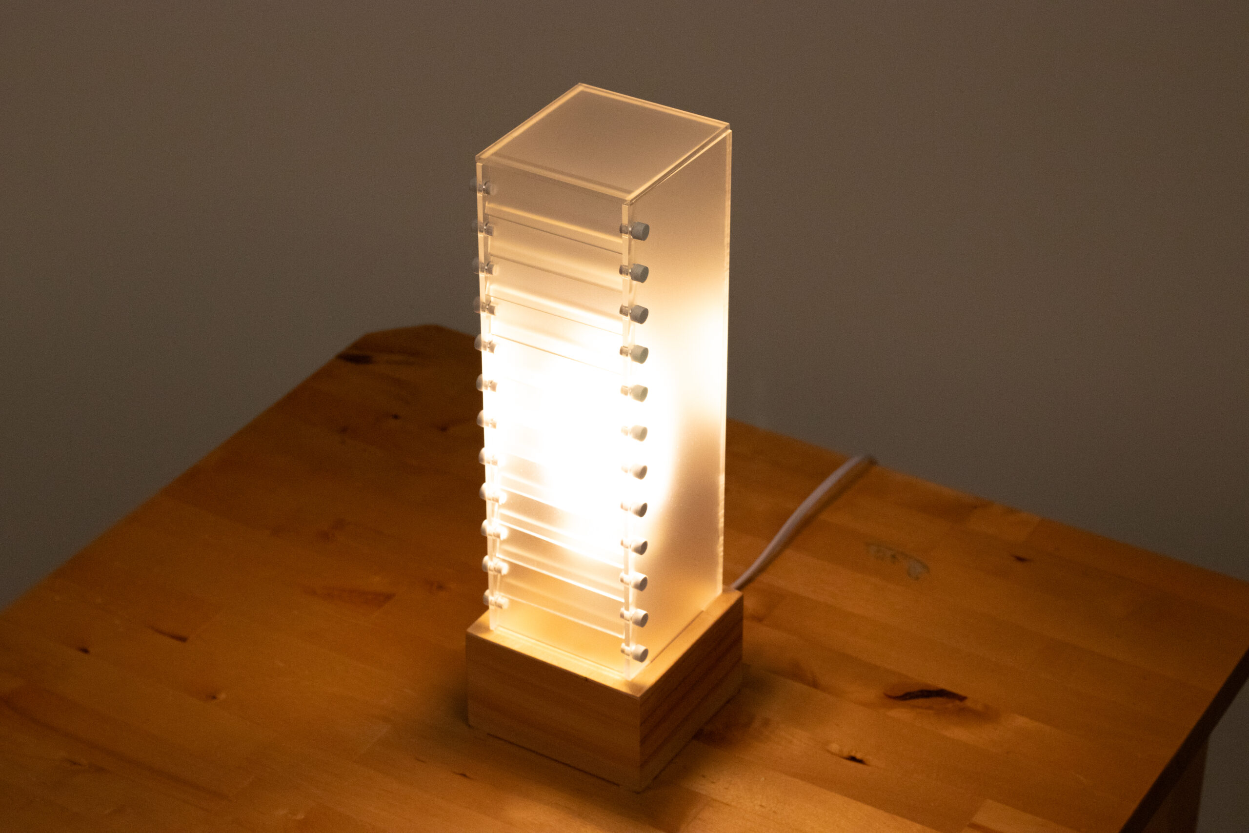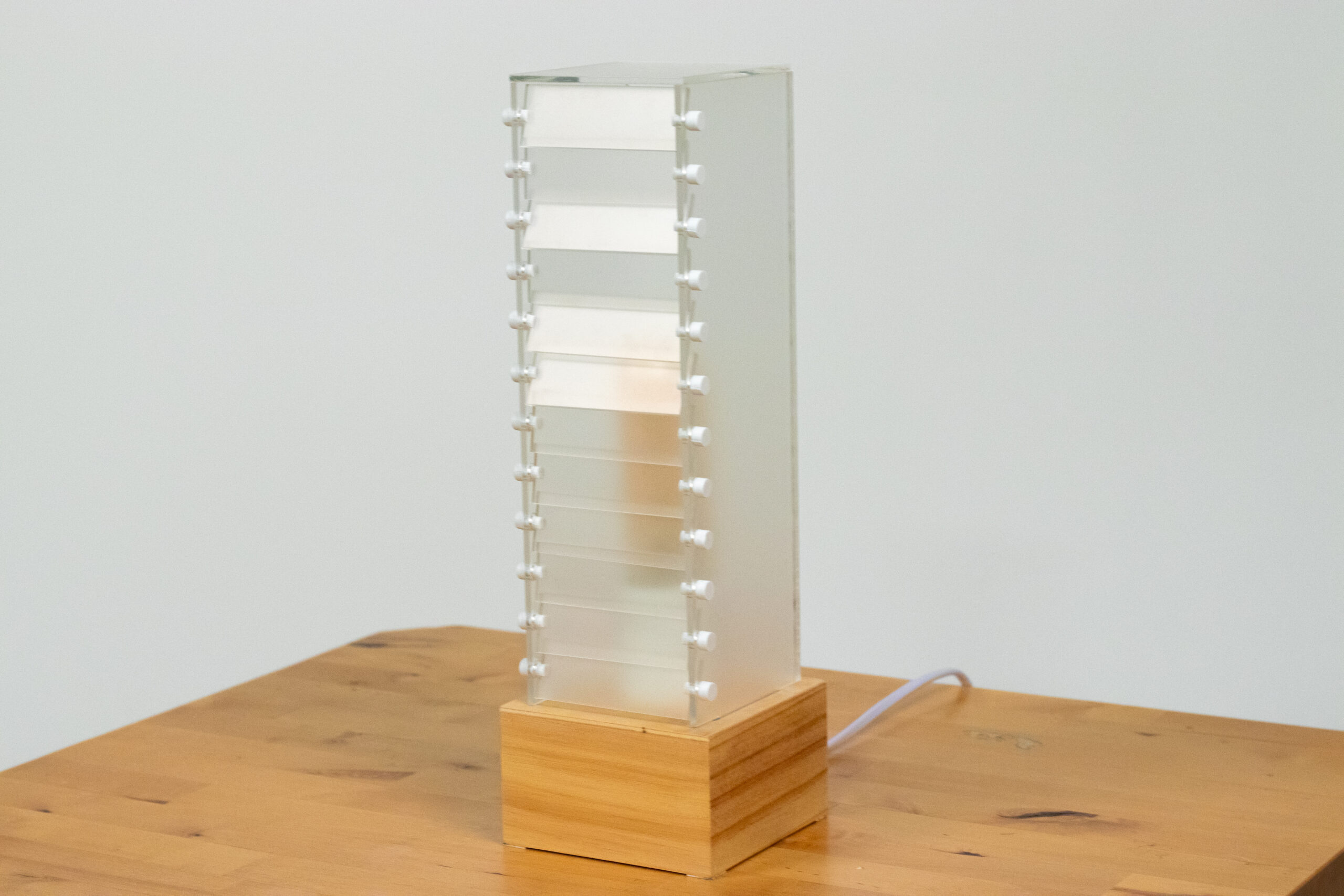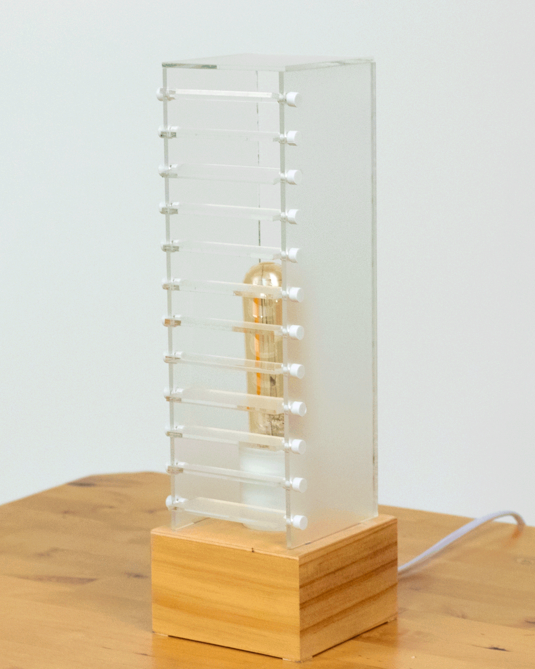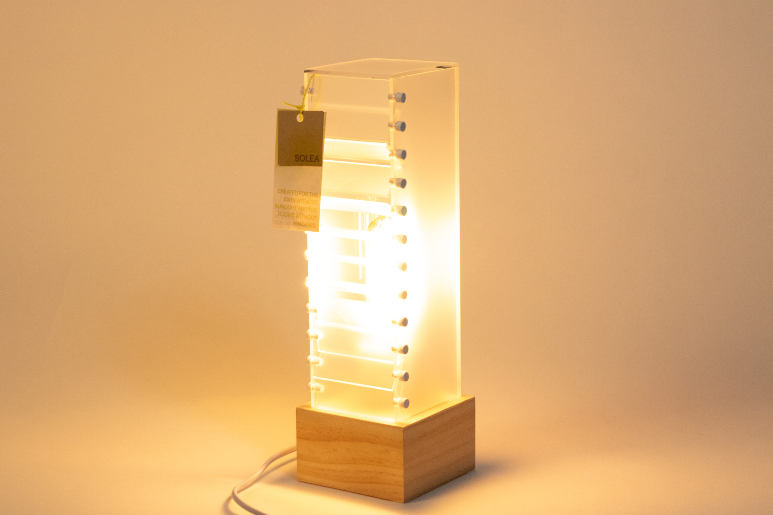 Frosted acrylic and wood lamp with manually adjustable slats, created for the days without sunlight and the rooms without windows.