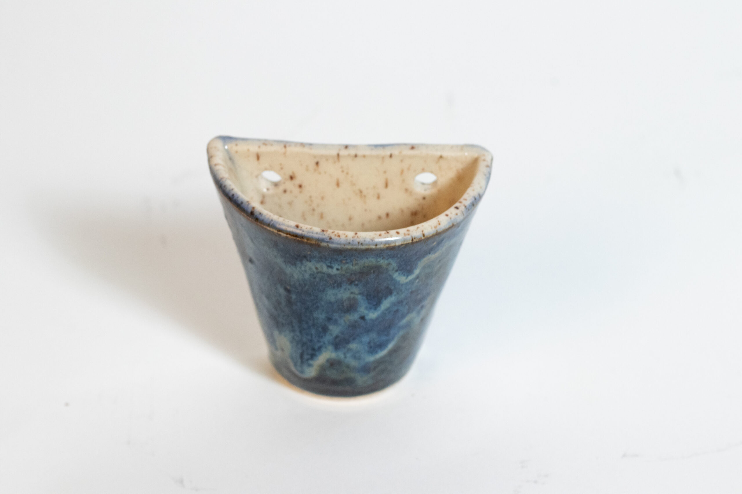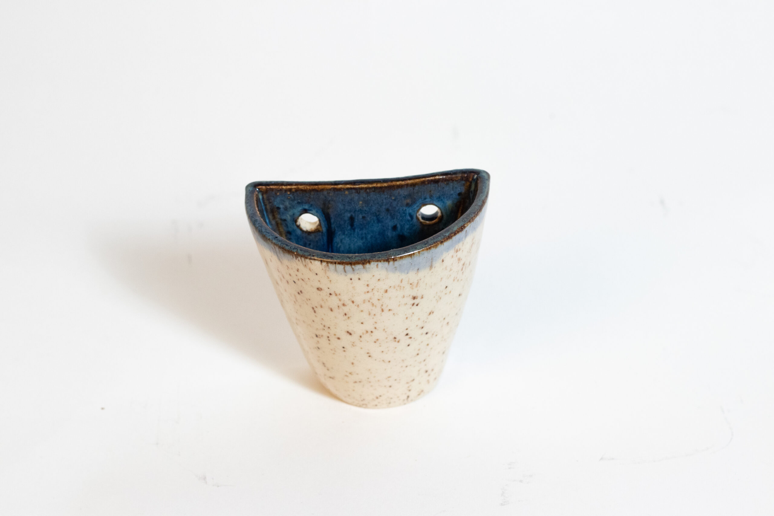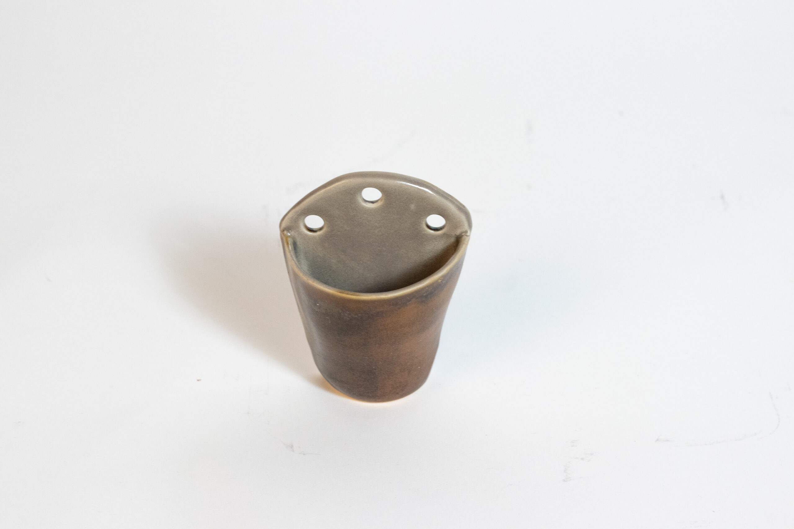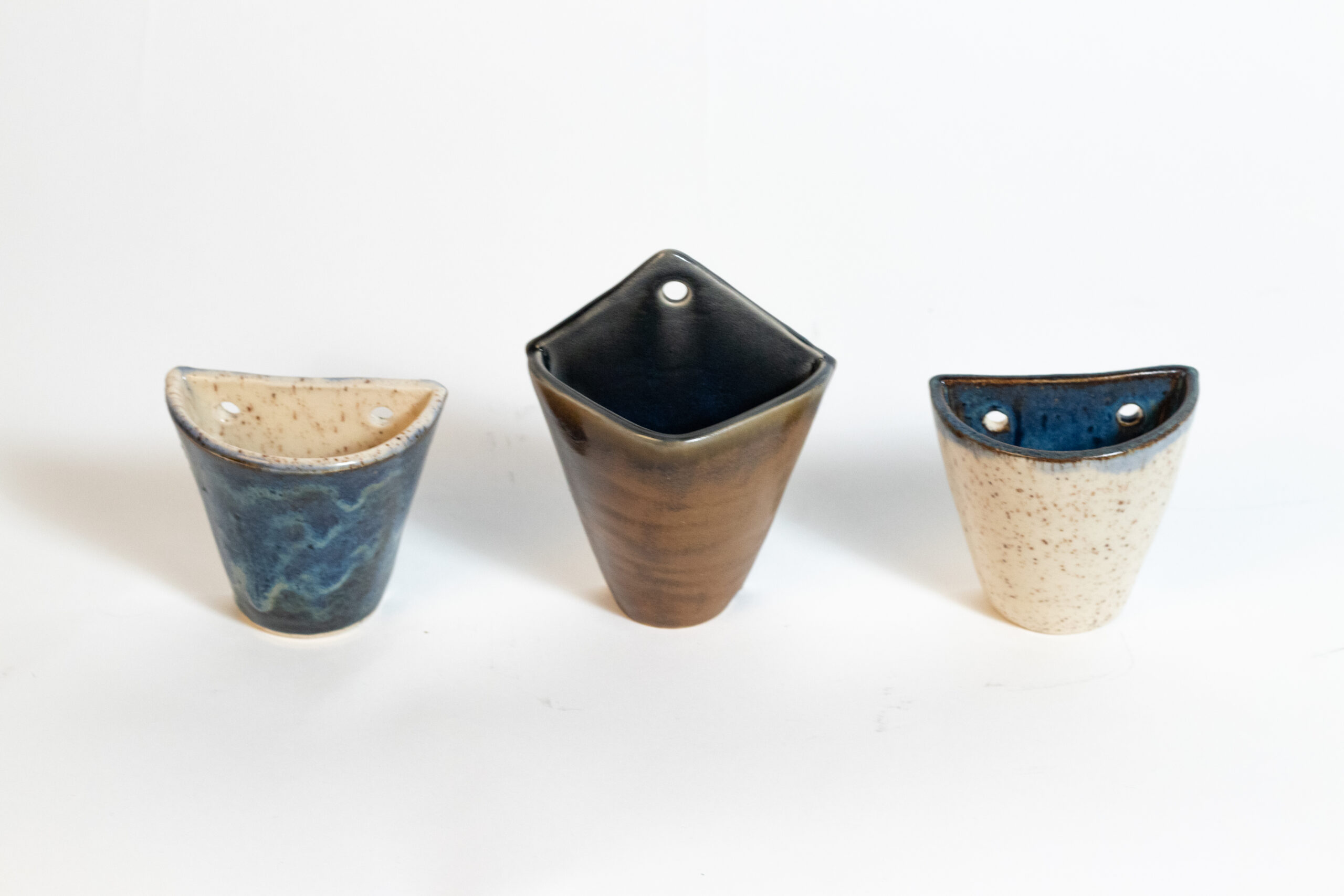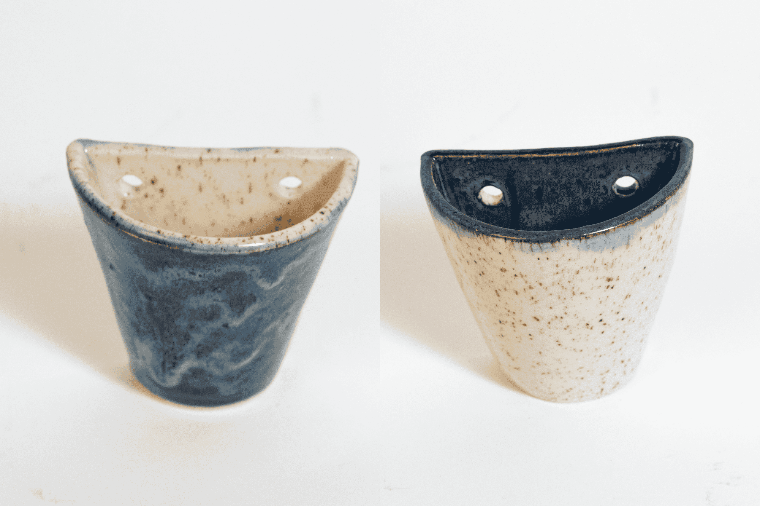 A hand thrown multi-use ceramic wall organizer, fit for holding art supplies, knick knacks, and even plants.